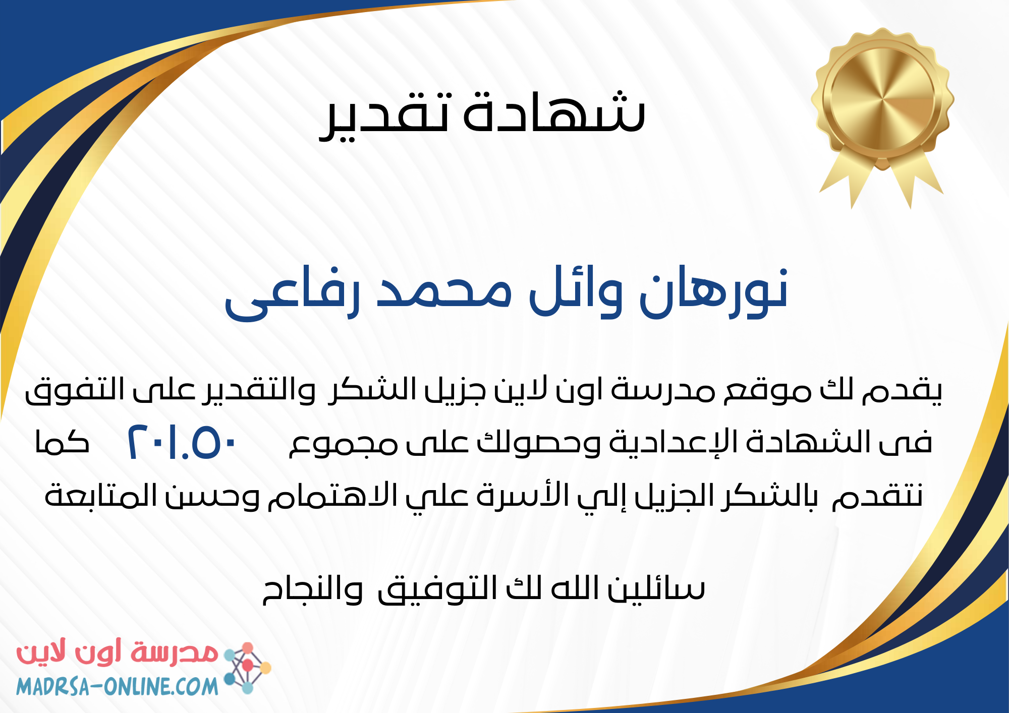 | اسم الطالب | نورهان وائل محمد رفاعى | |