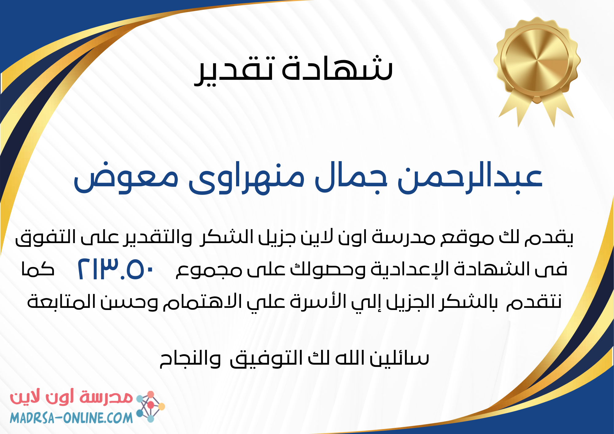 | اسم الطالب | عبدالرحمن جمال منهراوى معوض | |