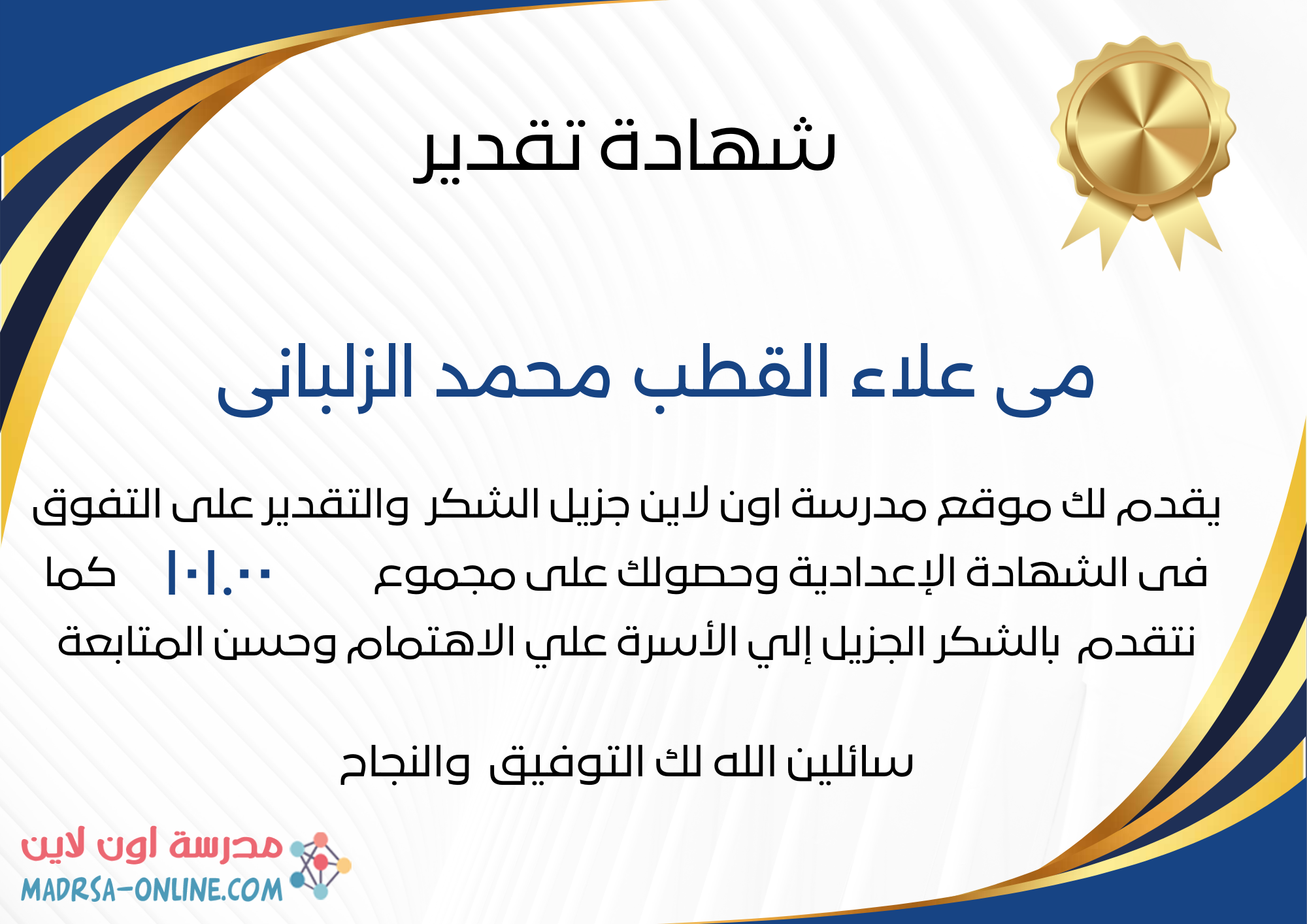 | اسم الطالب | مى علاء القطب محمد الزلبانى | |