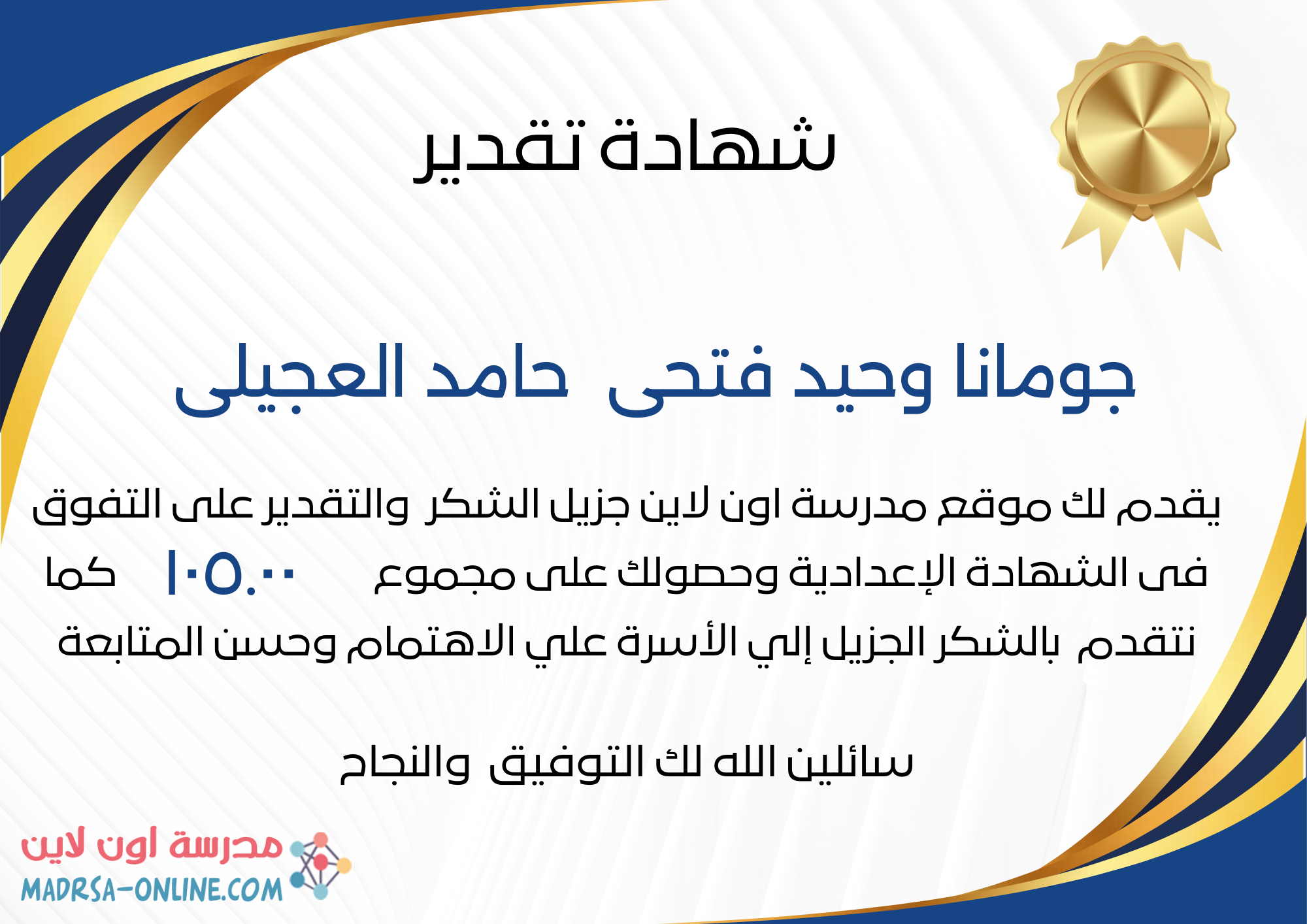 | اسم الطالب | جومانا وحيد فتحى حامد العجيلى | |