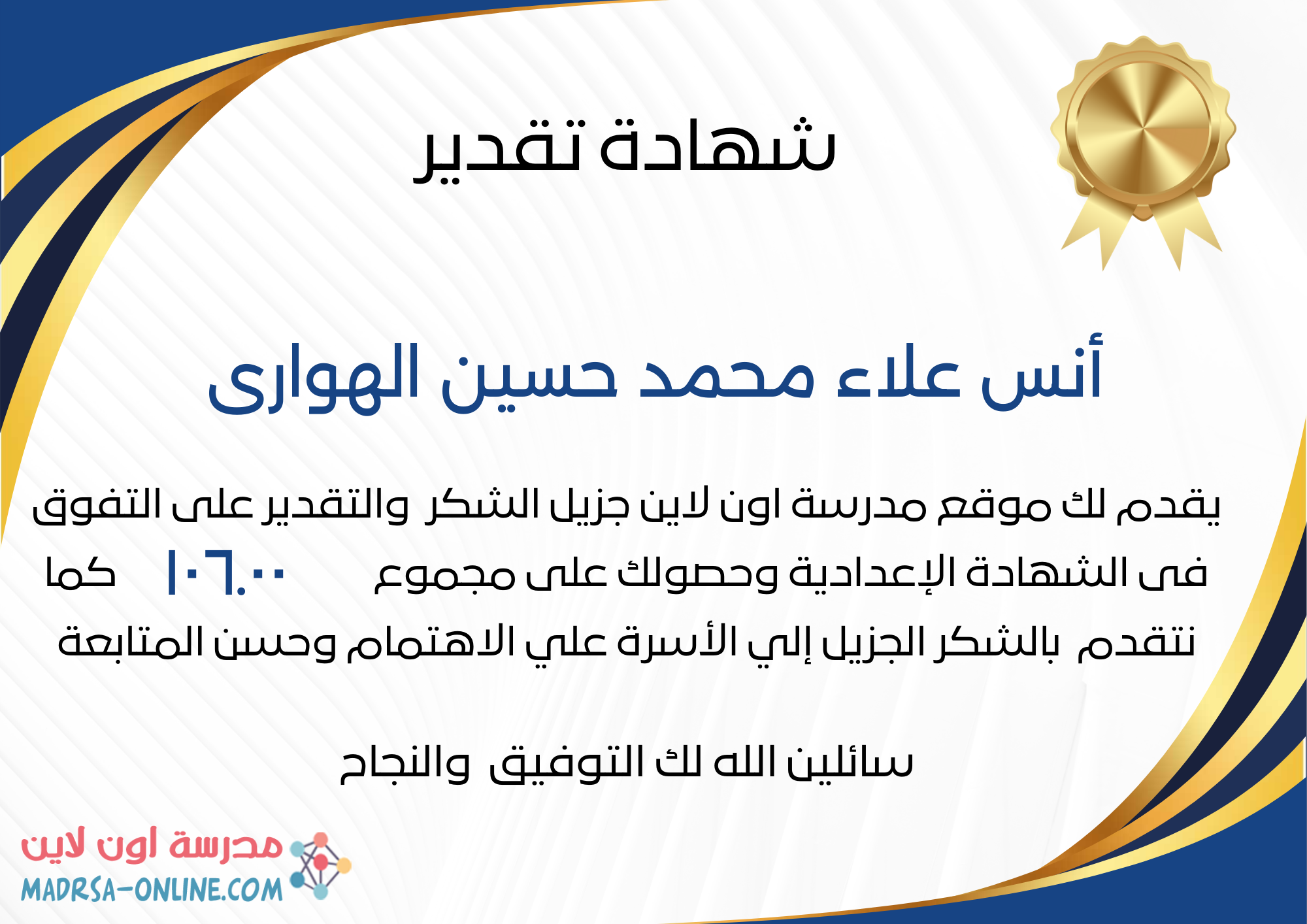 | اسم الطالب | أنس علاء محمد حسين الهوارى | |