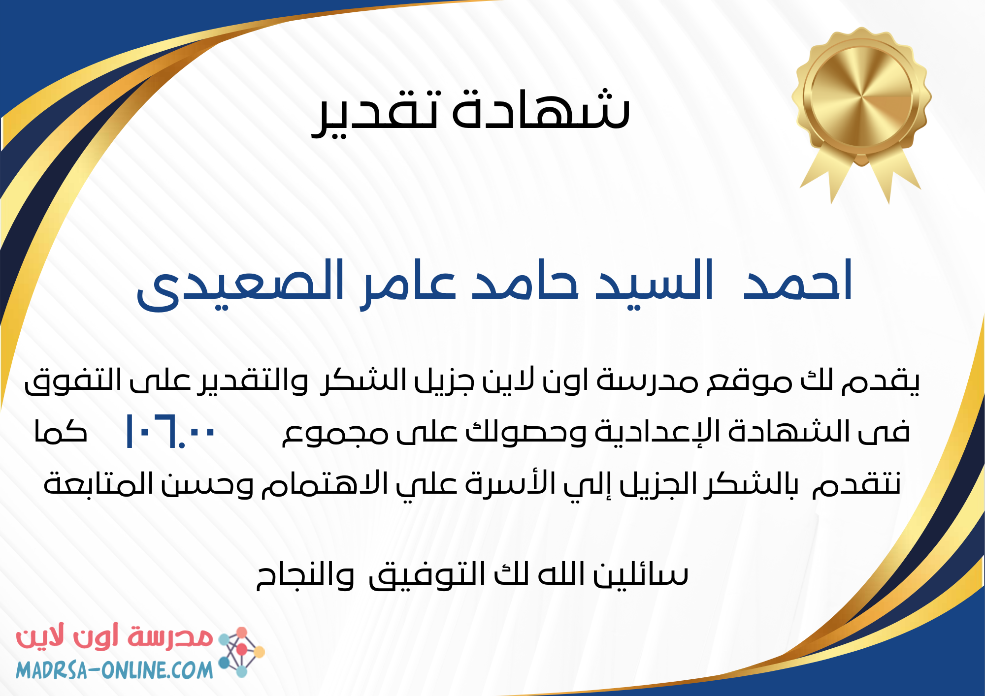 | اسم الطالب | احمد السيد حامد عامر الصعيدى | |