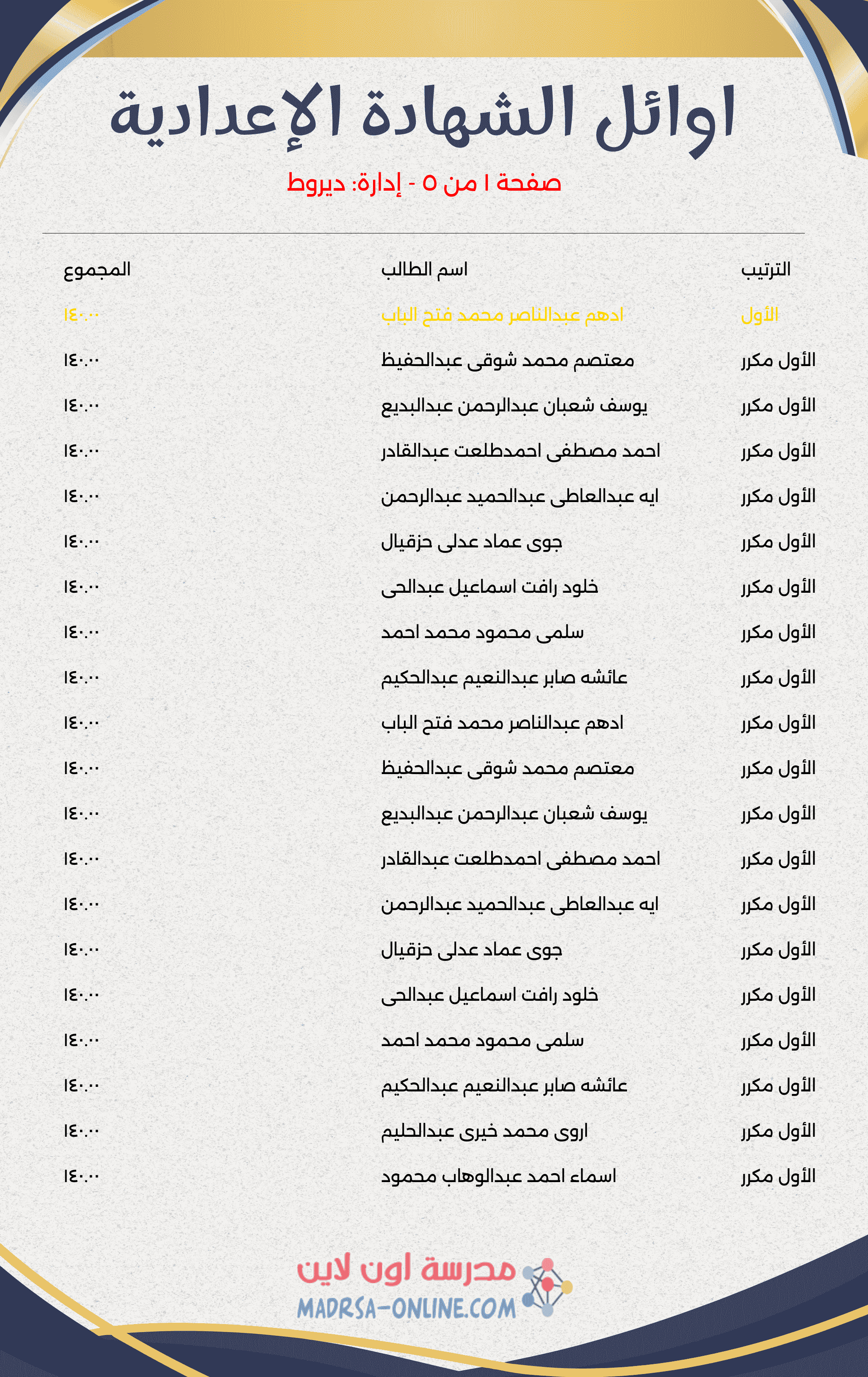 ويمكن للطلاب معرفة نتيجة الشهادة الإعدادية محافظة اسيوط 2026 عبر موقع مدرسة اون لاين المتخصص في عرض نتيجة الشهادة الإعدادية بأسيوط بالاسم فقط أو رقم الجلوس ومعرفة الدرجات والمجموع والنسبة المئوية وترتيب الطالب وتنسيق دخول الثانوي العام أو الثانوي الفني.