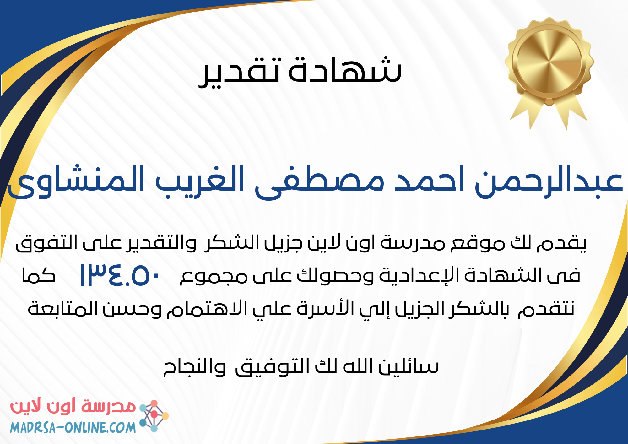 | اسم الطالب | عبدالرحمن احمد مصطفى الغريب المنشاوى | |