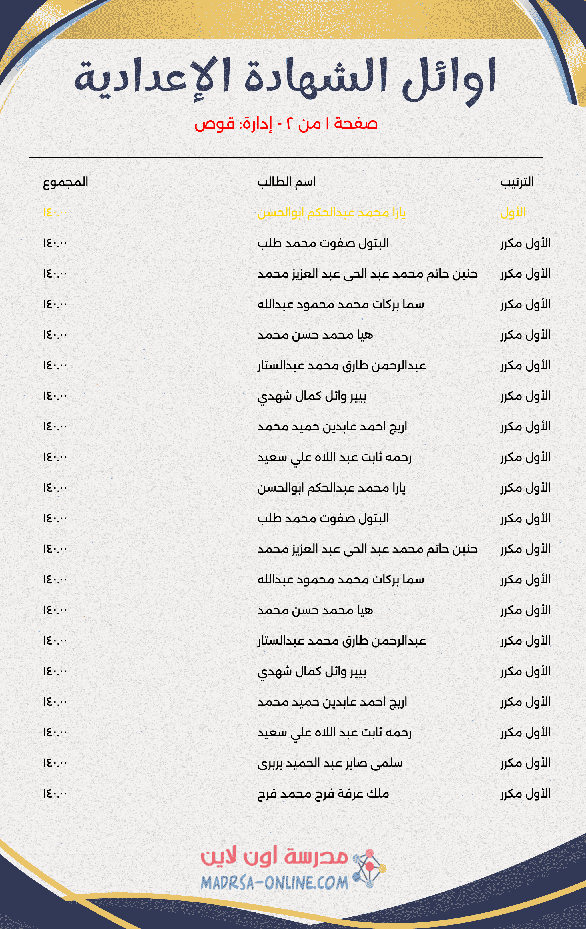 اوائل نتيجة الشهادة الإعدادية بقنا